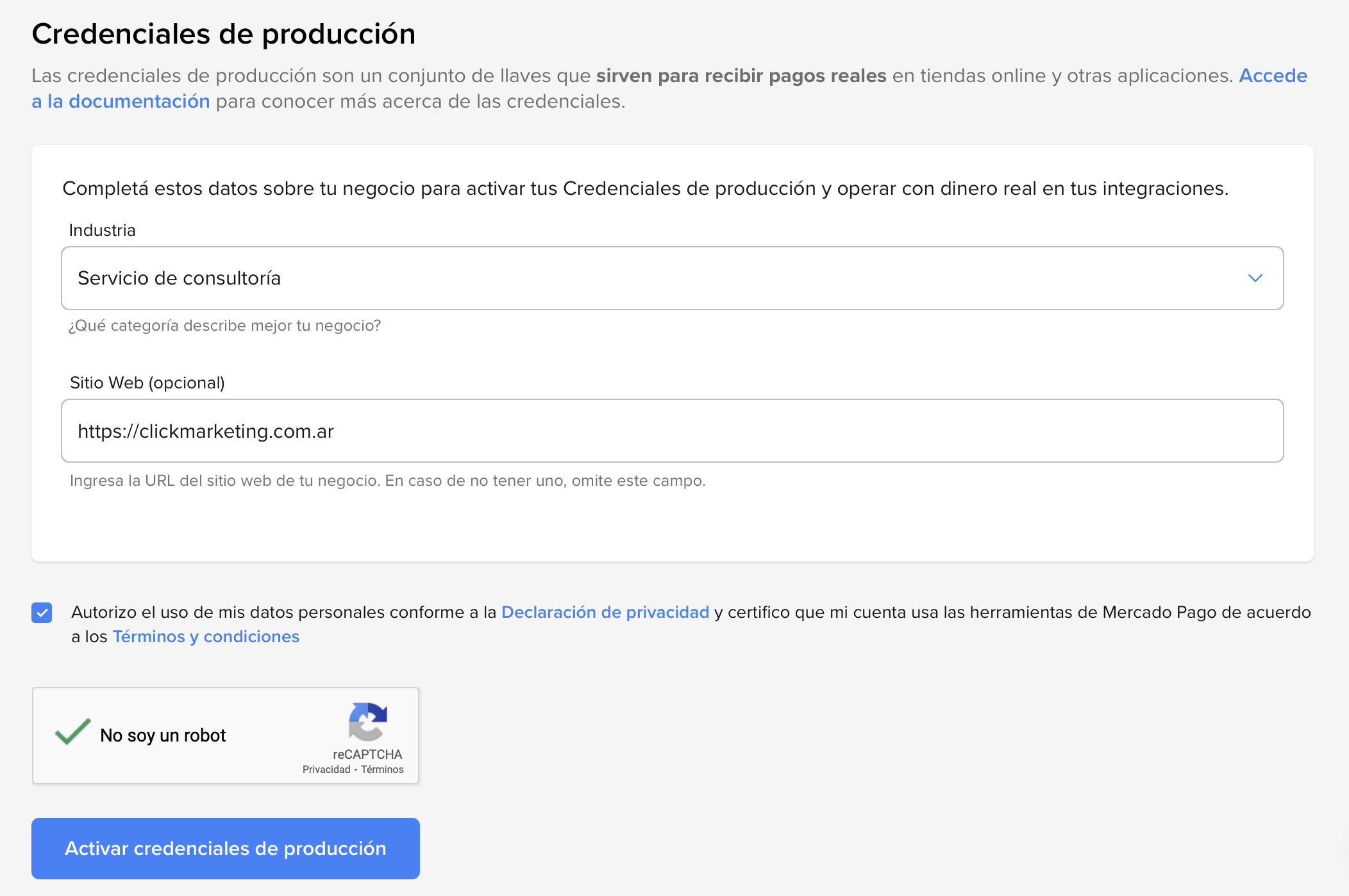 - Hacé clic en “Activar credenciales de producción”