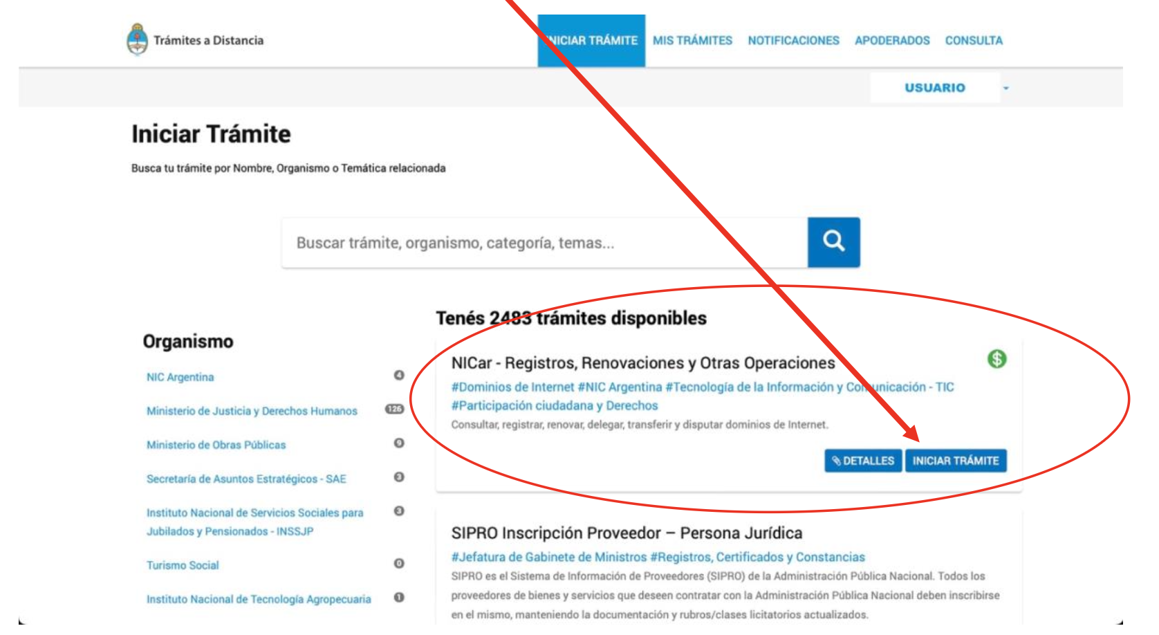 3. En el buscador de trámites, seleccioná NIC Argentina
