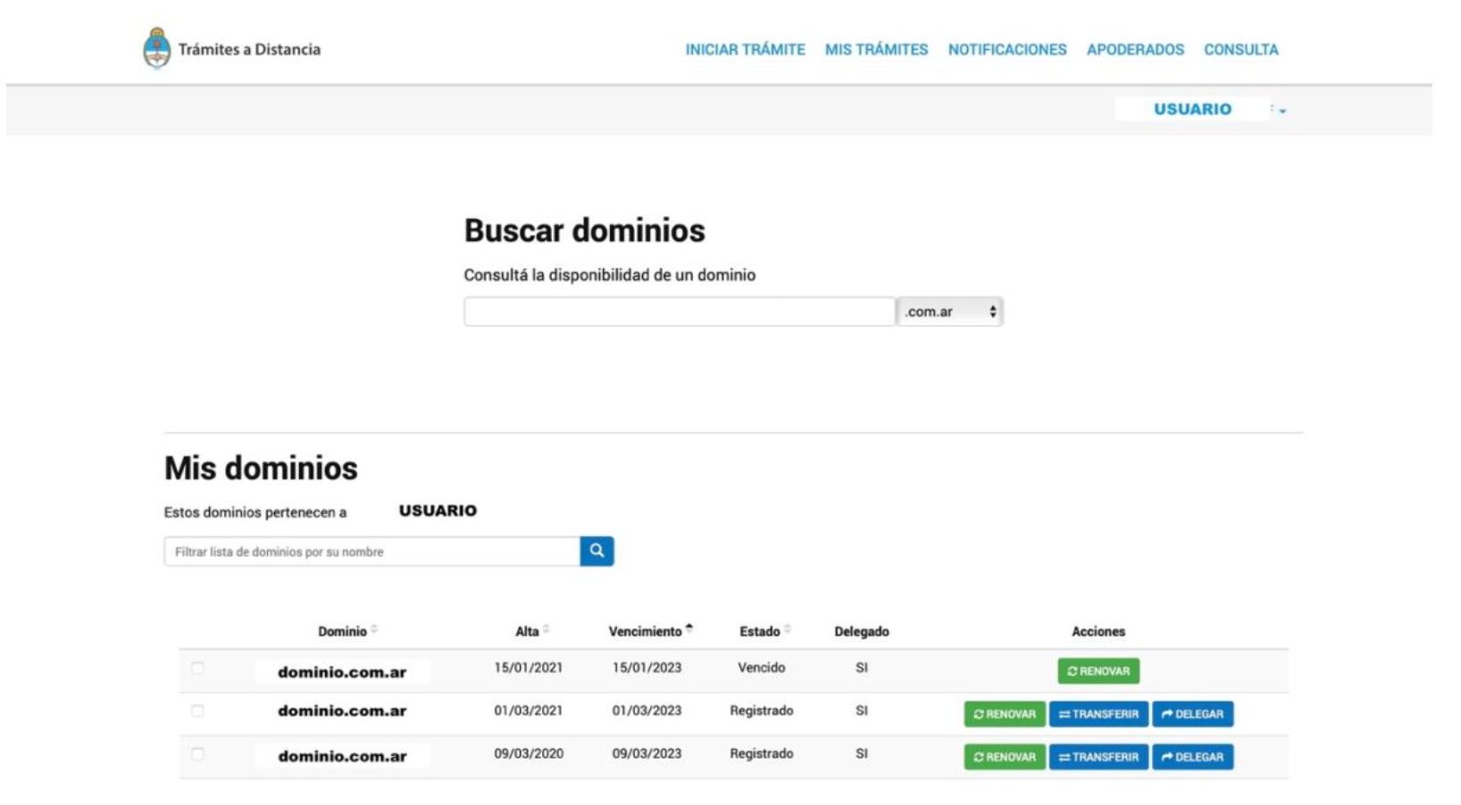 - Ubicá el dominio que querés delegar y hacé clic en “Delegar”.